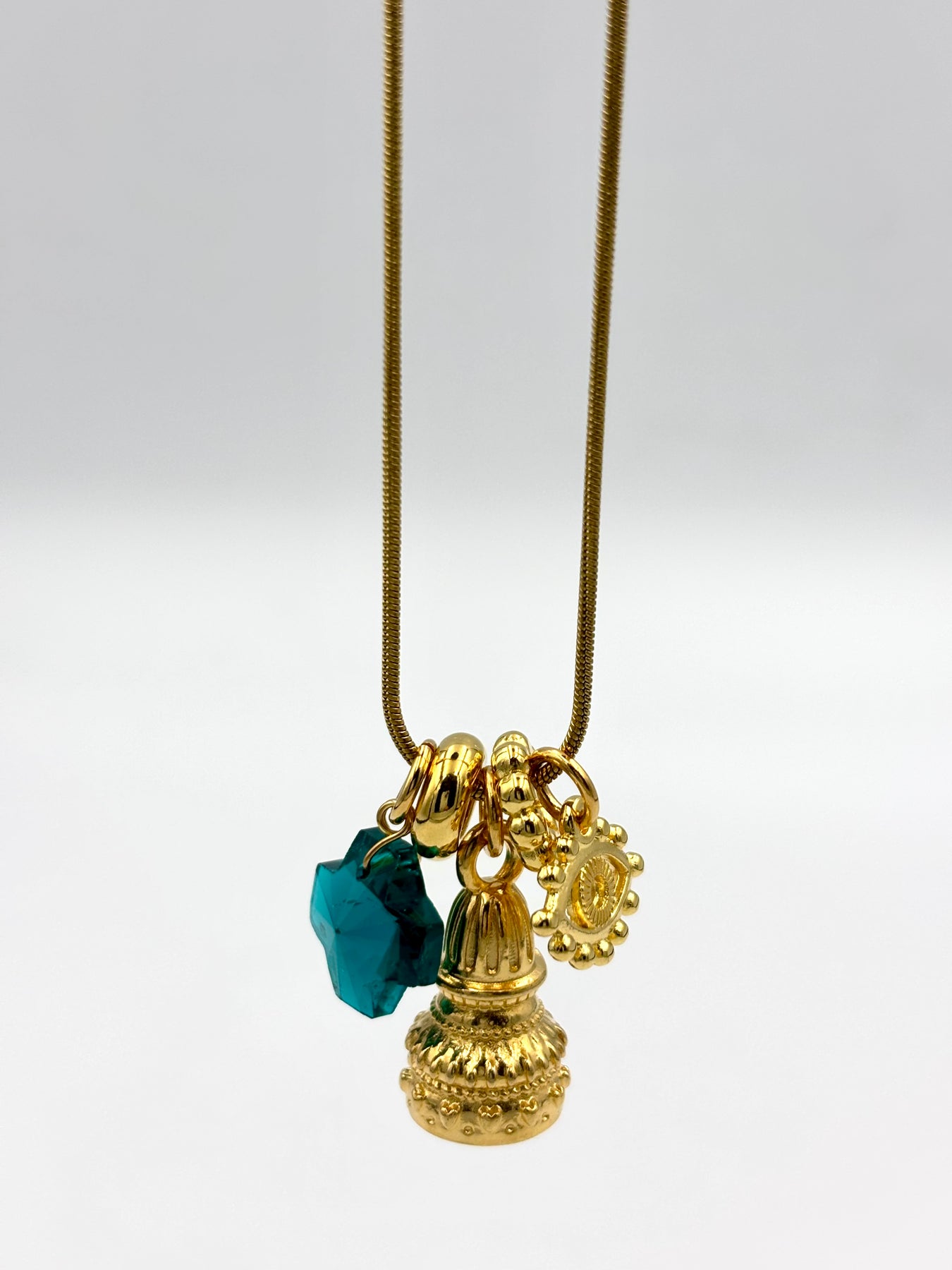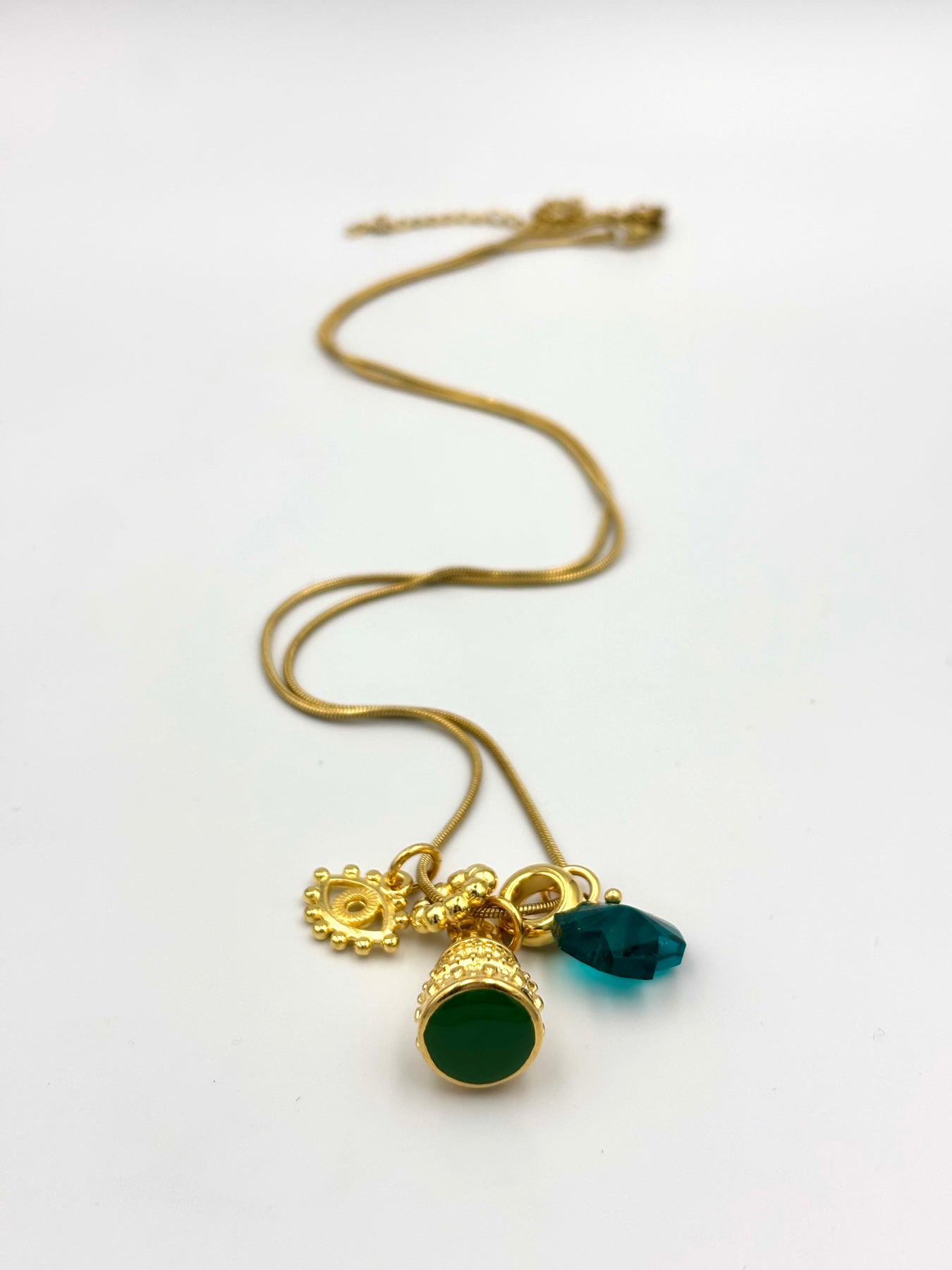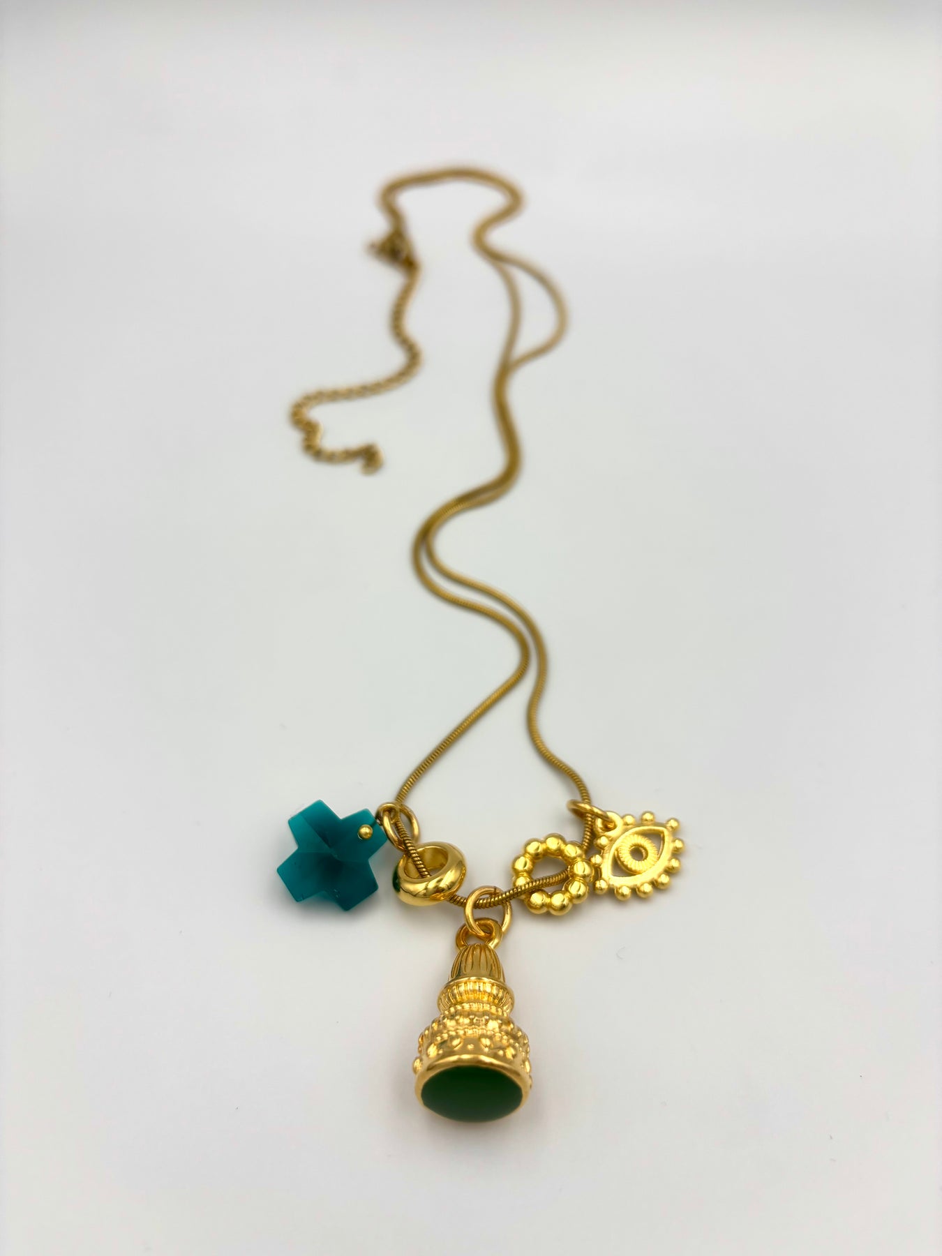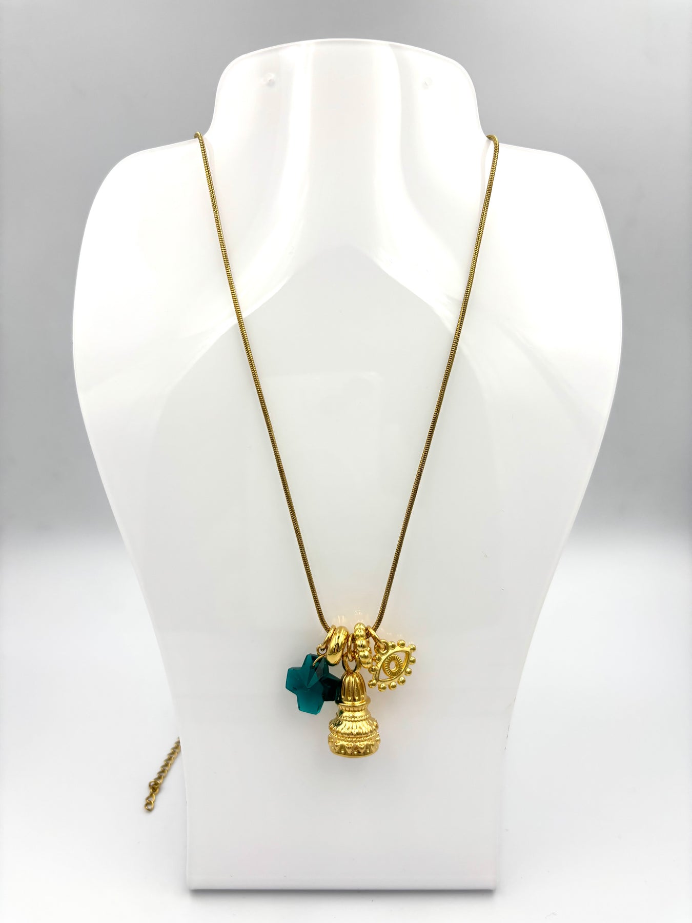 Μακριά ατσάλινη αλυσίδα με κεντρικό στοιχείο σε σχήμα καμπάνας με σμάλτο σε πράσινη ή καφέ απόχρωση. Διακοσμημένο με διαφανές πράσινο σταυρουδάκι, ματάκι και μικρά κρεμαστά στοιχεία που προσθέτουν κίνηση και μοναδικότητα. Ένα κόσμημα με γοητεία και μοντέρνο στυλ για κάθε εμφάνιση.